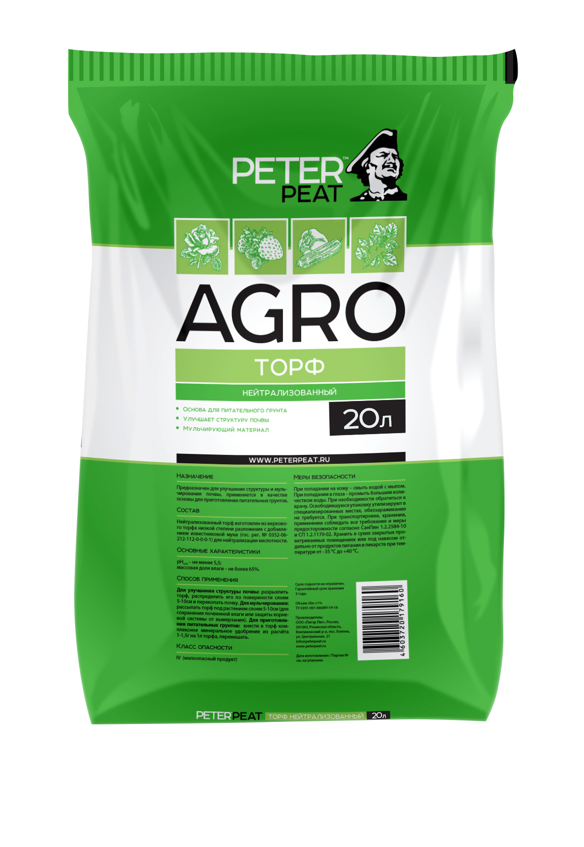Торф верховой нейтральный (фракция 0-20, Линия АГРО) 20 л - для улучшение структуры и мульчирования почвы, применяется в качестве основы для приготовления питательных грунтов.