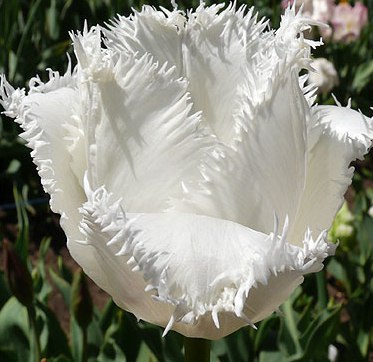 Тюльпан Daytona - сорт бахромчатый. Листья темно-зеленые, однотонные. Высота растения 35-50 см. Цветет в апреле-мае. Цветок крупный, белоснежный, с крупными снежно-белыми, иголчато-бахромчатыми лепестками. Размер луковицы - 11-12 см.