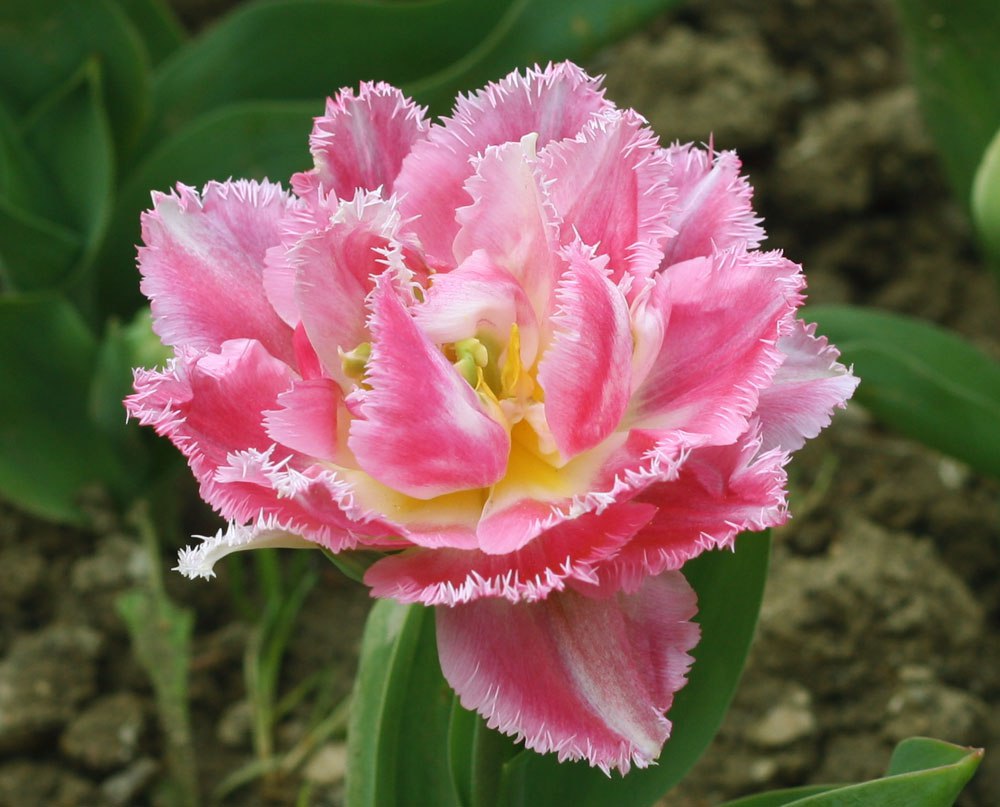Тюльпан Cool Crystal - один из привлекательных позднецветущих сортов, который относится к классу Бахромчатые тюльпаны. Цветки напоминают махровые пионы в инее. Они крупные, розово-белого цвета с игольчатым окаймлением верха лепестков. Как только цветок распускается, раскрывается лимонный желтый центр. Этот тюльпан невысокого роста, только 35-40 см в высоту. Стебли прочные, поэтому он с гордостью будет выдерживать весенние ливни. Продолжительность цветения около двух недель, в зависимости от погодных условий. Дает срезку высшего качества. Чаще всего его выращивают в регулярных посадках на клумбах или в контейнерах. Цветет тюльпан в конце сезоне.