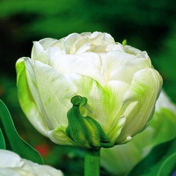 Тюльпан Maureen Double цветет в мае, образует белый с зелеными мазками пышный бокал высотой до 10 см, диметром 8-10 см. Особое отличие - высокая махровость (большое количество лепестков). Цветки напоминают густомахровые пионы. Обладает тюльпан средней скоростью роста, подходит как для озеленения и украшения клумб, так и для букетов, отлично растет на хорошо освещенном месте и в полутени. Красивый белый цветок возвышается на крепкой ноге, высотой до 50 см.