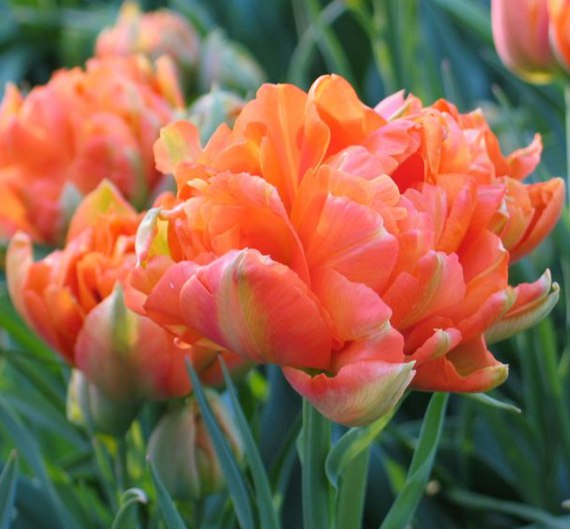 Тюльпан Orange Angelique - сорт позднего срока цветения. Высота растения 45-60 см. Листья длинные, темно-зеленые. Цветок крупный, густо-махровый, пионовидный, оранжево-розово-абрикосовый. Цветет в апреле-мае. Размер луковицы - 11/12 см.