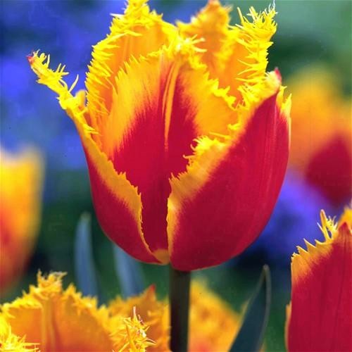Тюльпан Palmares - восхитительное многолетнее растение. Окраска цветка вишнёво-красная с широкой каймой жёлтого цвета и густой зубчатой бахромой. Форма цветка бокаловидная. Растение высотой до 45 см. Очень красиво цветёт, выделяется среди других весенних цветов. Сорт неприхотливый, но любит расти и цвести на солнечных местах. Подходит для посадки на любых садовых почвах. Цвести начинает с апреля месяца.