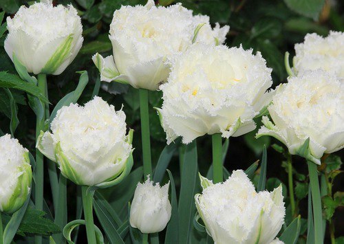 Тюльпан Snow Fever - цветок махровый и одновременно бахромчатый, каждый лепесток покрыт игольчатой бахромой. Белоснежный, очень крупный тюльпан. Средняя высота растения - 45 см. Сорт подходит на срезку. Зацветает относительно поздно.