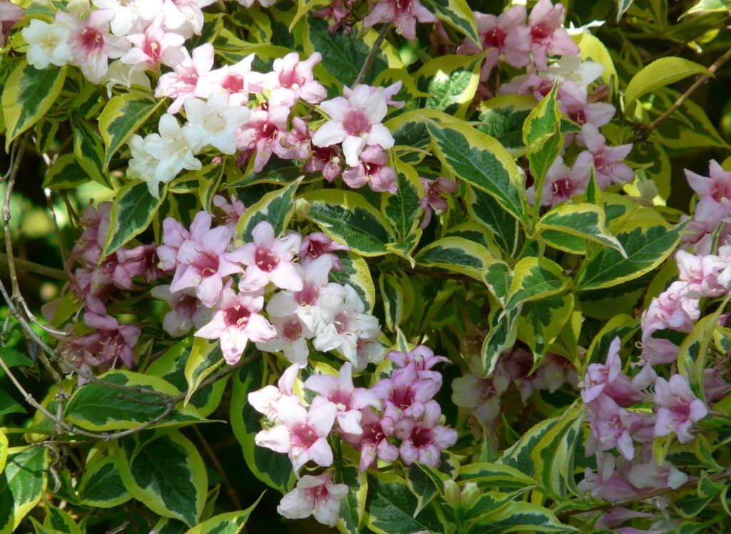 Вейгела Variegata цветет обильно и продолжительно зонтиковидными соцветиями по 3 бутона. Цветки крупные (длинной 4-5 см, диаметром 2-5 см), колокольчатые, ярко-розовые снаружи и пурпурно-красные внутри. Куст около 2 м высоты, раскидистый, густооблиственный, с шаровидной серой, на ветках - светло-бурой корой и ярко-зелеными, зубчатыми, эллиптическими листьями. Молодые побеги красноватые.