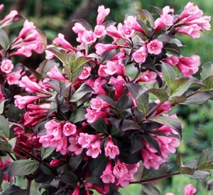Вейгела Фоллис Пурпуреус - Кустарник от 1 до 1,5 м высотой с густой кроной диаметром около 2 м. Листья эллиптические, коричнево-красные, красно-зеленые, длиной 6 - 8 см, осенью долго остаются на ветвях .Цветки длиной 2,5 - 3 см, темно-розовые с желтой серединкой, собраны в соцветия по 3 - 4 штуки, контрастируют с листьями Цветет в июне-июле.