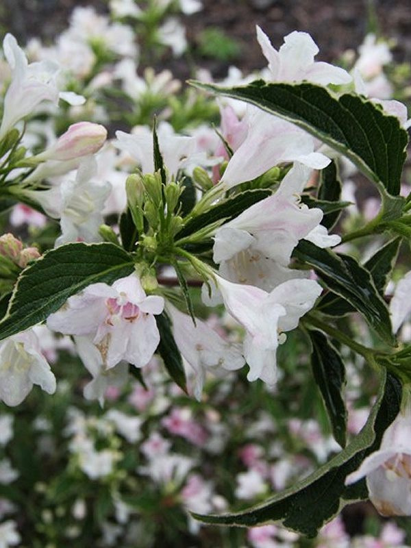 Вейгела цветущая Сюзанна - декоративный, листопадный, раскидистый кустарник, высотой до 1м. Листья эллиптические, светло-зеленые, с аккуратной белой окантовкой. Осенью окантовка становится бело-красной.