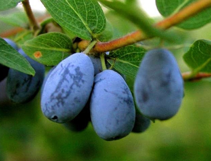 Саженцы жимолости Радость моя принадлежат к зимостойким сортам. Кустарник среднерослый образует раскидистую крону со средними, прямыми побегами. Листья зеленые, матовые, цветки желтые. Плод крупный, темно-синий, овальной формы, сочный на тонкой плодоножке, кожица тонкая. Крупномер жимолости Радость моя характеризуется высокой зимостойкостью, слабой осыпаемостью плодов. Урожайность средняя – 2,3 кг с одного кустарника. Достоинства сорта являются: отличная устойчивость к перепадам температур, засухоустойчивость, жаровыносливость, десертный вкус плодов.